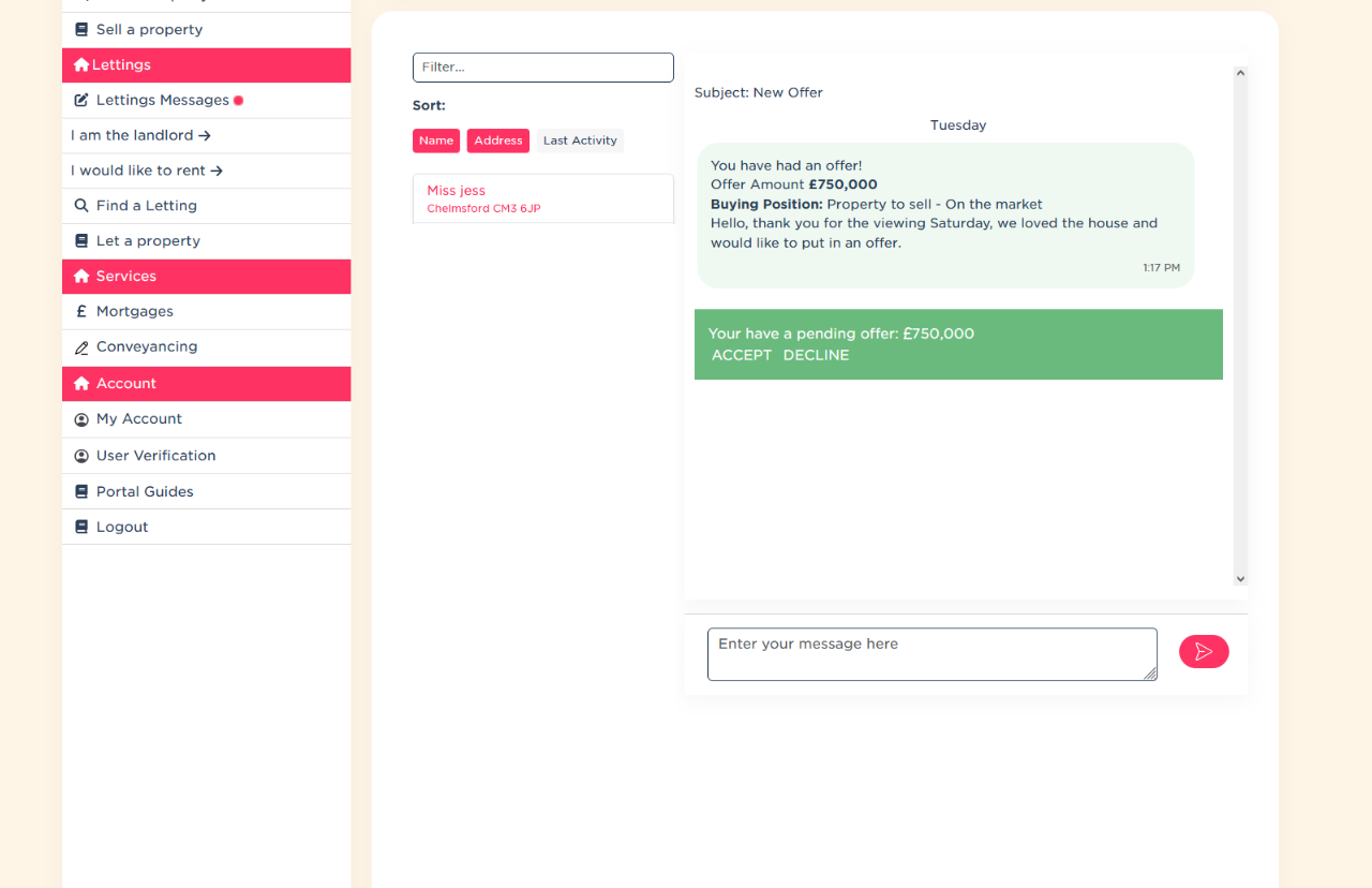 The Offers section of your dashboard is where you review, negotiate and manage all offers on your property. From receiving notifications to accepting or declining offers, uploading solicitor details and progressing to the Memorandum of Sale, this area keeps the entire offer process clear and organised. It ensures you stay informed at every stage and helps your sale move forward smoothly.