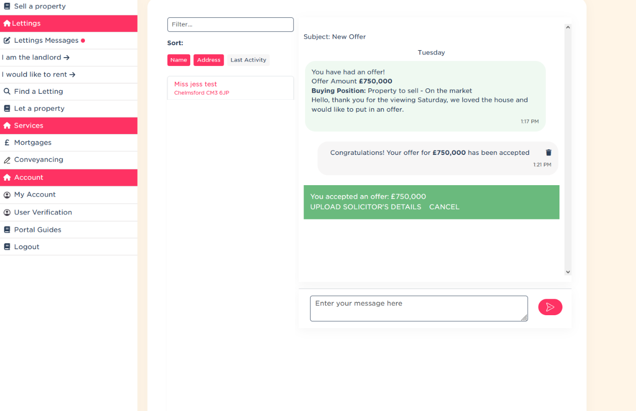 After you accept an offer, click ‘Upload Solicitor Details’ in the green bar at the top of the offer message and enter your solicitor’s information as soon as possible.