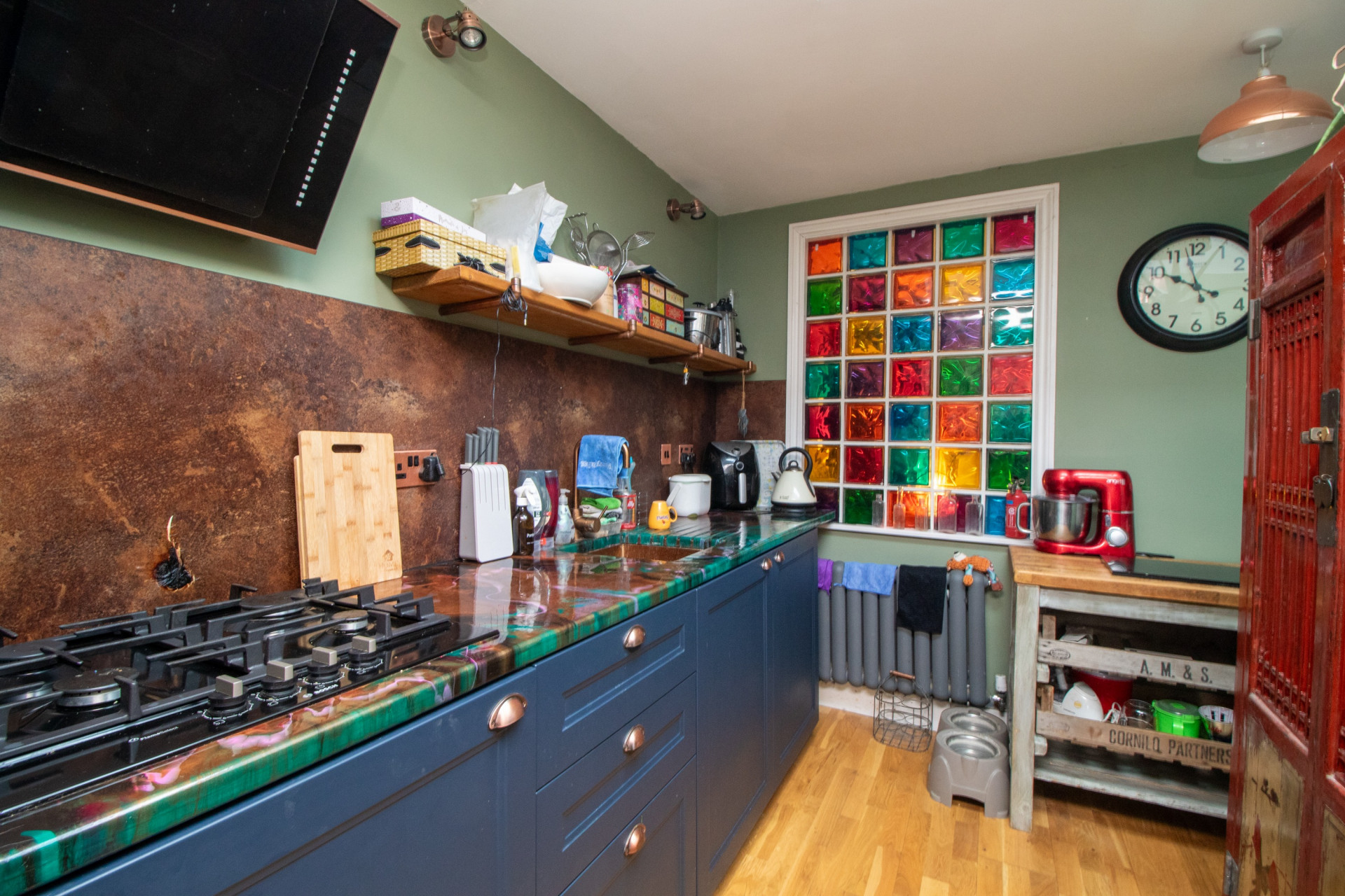 Recently refurbished with new appliances, featuring: large window, lighting, floor and high mounted cupboards, sink with drainer and mixer tap, double oven, built in hob, space for a fridge freezer, radiator, wooden flooring and door leading out to the garden.