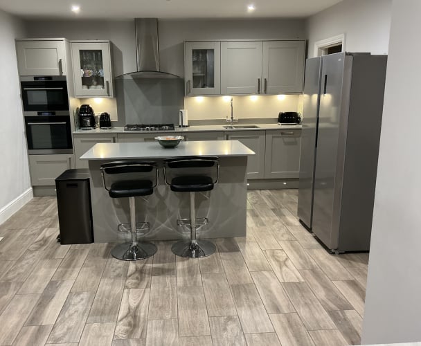 Shaker style Kitchen units with AEG appliances (self cleaning oven). Double oven inc microwave. Matching granite worktop and sink drainer. Central Island with fridge and freezer under. Ceramic floors with underfloor heating. Underfloor heating with room control. TV aeriel point in dining area