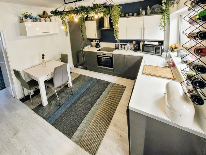 Fitted units with single drainer sink unit. Built in cooking facilities include an electric induction hob, oven and cooker hood. There is an integrated fridge freezer, plumbing for dishwasher , UPVC double glazed window, central heating radiator and under stairs cupboard and open stairs