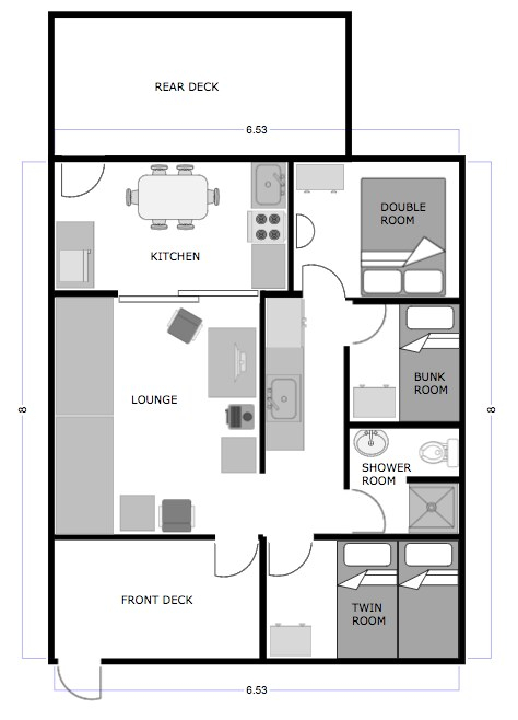 Twin bedroom, with roof-line double glazed window, swinging window, and large picture window viewing on to the front deck. Electric wall heater.