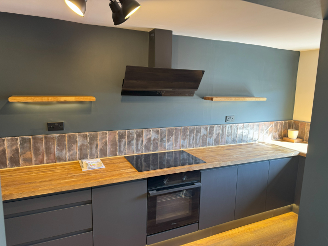 Newly fitted modern kitchen with warrantied appliances (Fitted Dishwasher, Oven, 5 Zone Hob and Extractor Hood). Mood lighting throughout and a designer radiator. Includes a breakfast bar and appliance cupboard.
