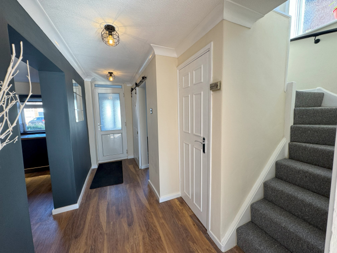 Newly refitted double glazed dual Patio Doors. Hardwood flooring throughout leading onto the rear patio. Oak and marble fireplace with electric fire.