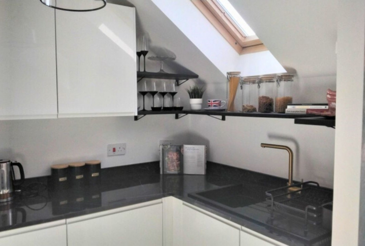 Wren white high gloss base & wall units are complimented by black marble effect worktops, a square black sink/drainer with a gold lever tap and open black shelves under the Velux window. An integrated fridge, freezer, cooker and induction hob complete this beautiful kitchen.