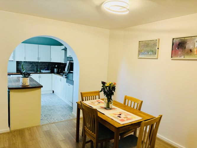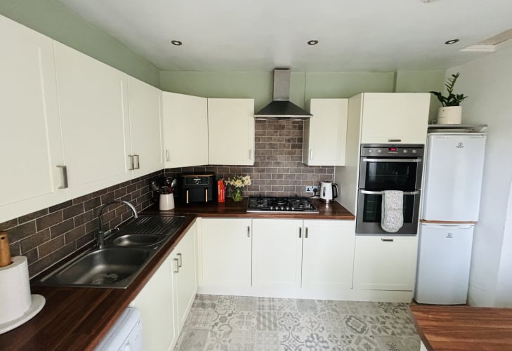Kitchen has space for white goods including fridge/freezer, slimline dishwasher, and washing machine. Double oven and 5 ring hob. This kitchen extension and dining room provides open plan living with patio doors to the rear garden