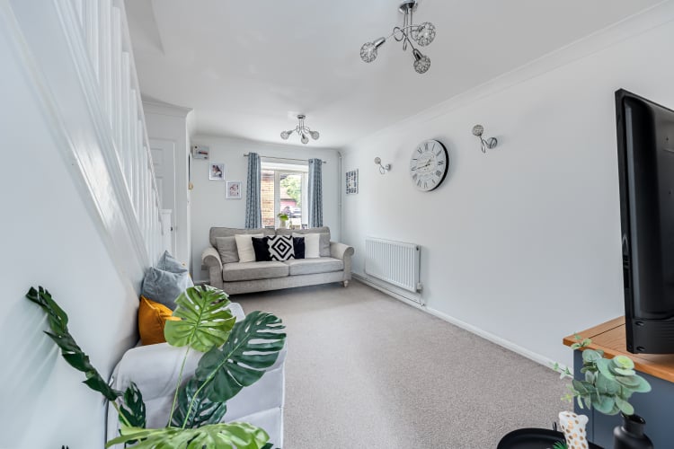 Immaculately presented 2 bedroom mid terrace property with private sunny rear garden and driveway and garage to the front. Lounge to the front with kitchen/diner to the rear leading to a lean-to giving additional indoor space. Upstairs are 2 well presented double bedrooms both containing built in cupboard/wardrobe space. The modern bathroom suite provides an electric shower over a P shaped bath with basin and toilet and also has a cupboard to house towels and bedding etc. To the rear of the property is a low maintenance decked private garden which is a lovely sun trap during the summer days. uPVC windows and central heating with new boiler all fitted in 2021.