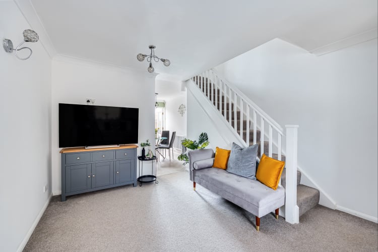Comfortable carpeted lounge with window to the front and radiator and TV point.