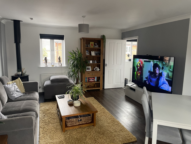 Dual Aspect, log burner, Large gloss white storage units. Single drainer sink unit with mixer taps, gloss white wall and base units with work tops, built in dishwasher, built in new oven, inset gas hob unit with concealed hood, space for washing machine, fridge/freezer space. Deceptively spacious.