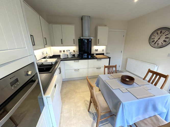 Modern range of units, built in appliances including an electric oven, hob and fridge/freezer. Radiator. Patio doors lead out onto the rear garden. Door from utility into: