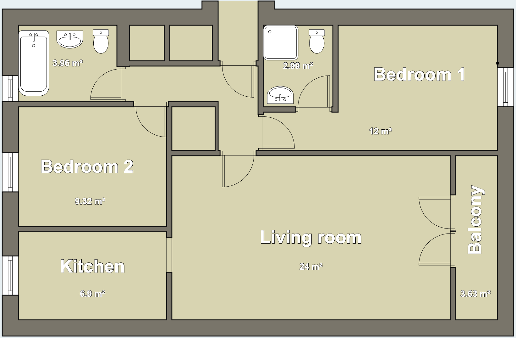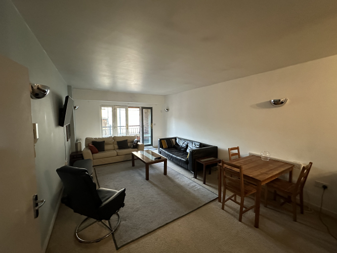 Wall mounted storage heaters, french doors to balcony, opening leading to kitchen.