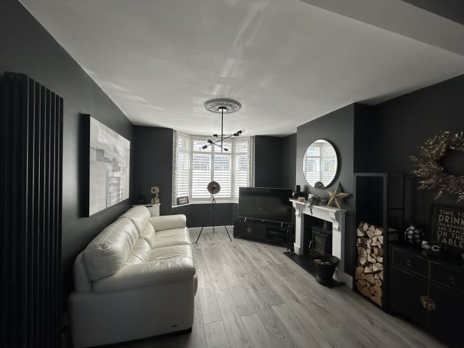 Open-plan living/dining room filled with natural light from large dual aspect windows fitted with wooden shutters, perfect for relaxing or entertaining. For extra warmth in the winter, in addition to the traditional vertical column radiators, there is a DEFRA approved log burner to keep you cosy!