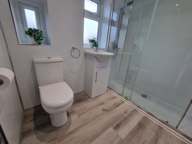 Brand new with a white suite comprising of toilet, large shower, sink with vanity unit and towel rail. New flooring