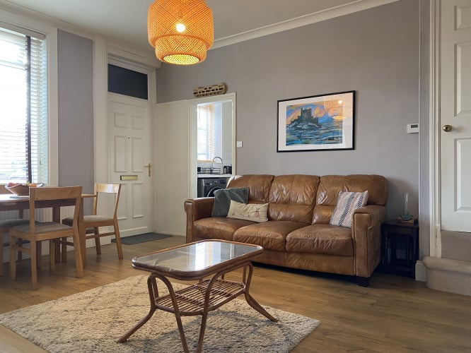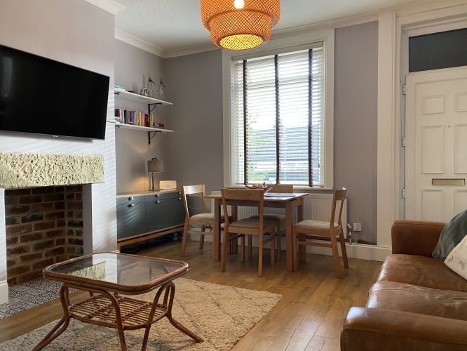 Spacious living room, with ample space for dining table and two large sofas. Feature fireplace, ceiling rose and stylish flooring give character. Large double glazed window to front, gas central heating radiator and stairs to first floor.