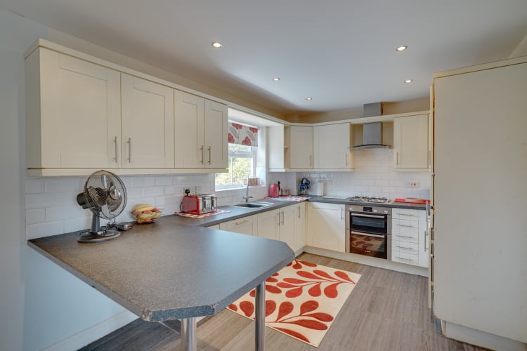 To the rear of the property, with integrated Fridge/Freezer & Dishwasher. Ample double sockets, Double Oven with Gas Hob, & working extractor fan. Double glazed doors leading to the Dining Room, plus a door to Utility Room.