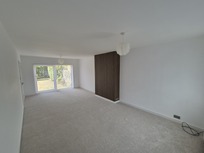 Large through lounge/dining room, flooded with light, patio doors onto the garden. The room boasts a decorative wood panel effect chimney breast, that has provisions for both gas and electric fire options. New radiator, carpet and modern skirting/architrave complement the fresh look of this room.