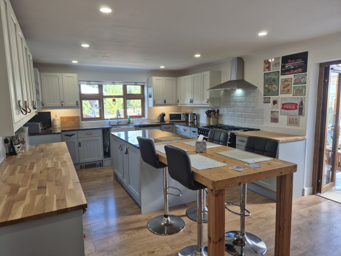 The kitchen has many wall and floor cupboards, butler sink with mixer tap, Rangemaster Toledo 5 burner double oven, space for a dishwasher, and bespoke handmade breakfast bar. With double doors leading into the conservatory.