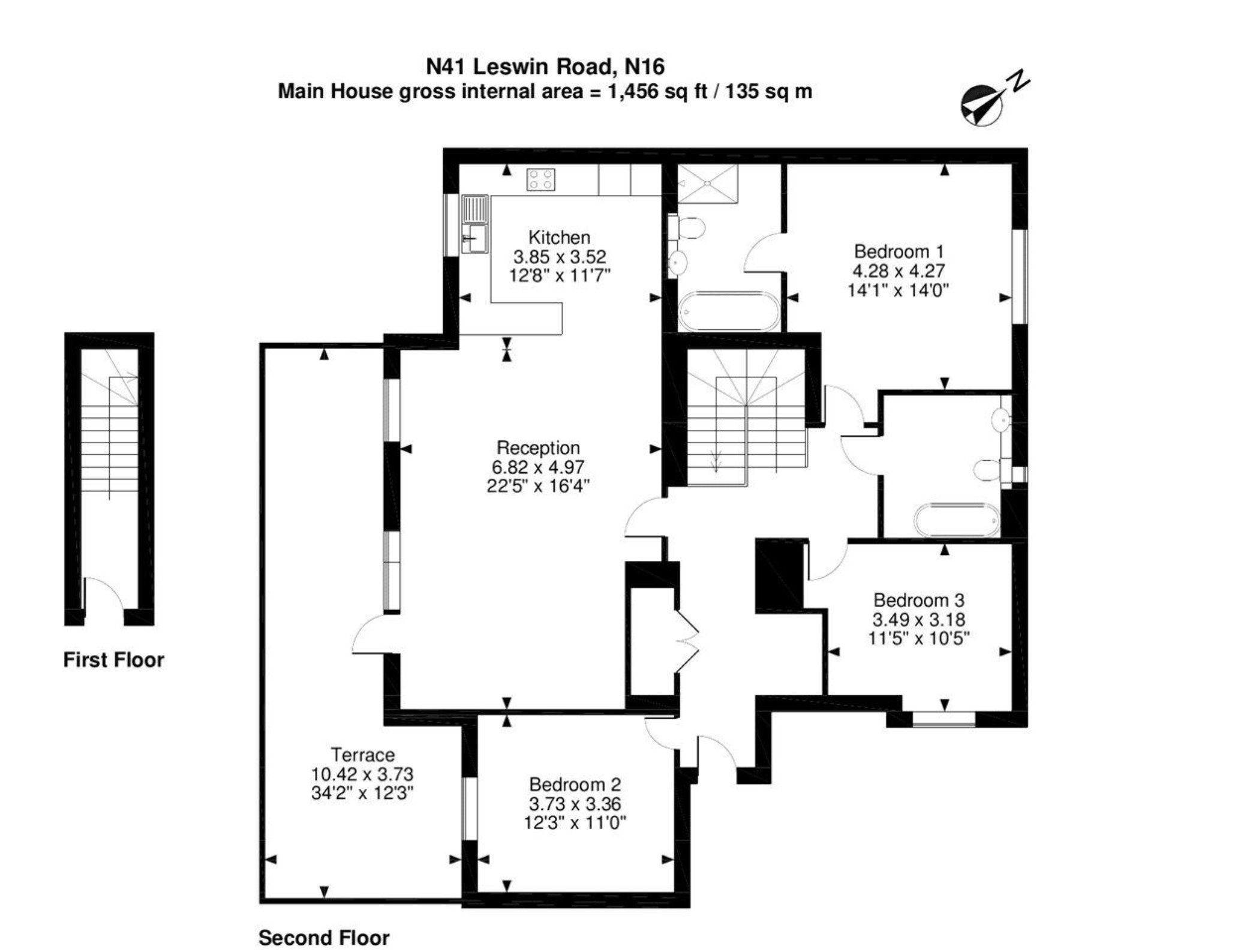 Penthouse in the heart of Stoke Newington, set atop a former Victorian schoolhouse. Spanning 1,456 sq ft, the apartment is unlike anything else in the area, with a private lift, huge terrace and breathtaking views across the London skyline. The entire top floor is dedicated to a light-filled open plan living space and three generous bedrooms, making this a rare opportunity to own one of Stoke Newington’s most distinctive homes. The Tour The building’s elegant Victorian frontage gives little away of the light-filled contemporary space within. The penthouse is reached via a secure, private lift that opens directly into the apartment. From here, engineered wood flooring flows throughout, uniting an open-plan arrangement of living, dining and kitchen areas. Large windows frame far-reaching views — considered the best in Stoke Newington — while double glass doors open to the wide private terrace, planted with established greenery to create a sheltered outdoor room in the sky. The kitchen sits to one side of the living space, its sleek lines and integrated appliances lending a modern, understated elegance at the heart of the home. Three generous double bedrooms are arranged for maximum privacy. The principal suite is a calm retreat, complete with a Lusso stone-tiled en suite bathroom. A second bathroom, also finished in Lusso stone, serves the additional bedrooms, each of which enjoys a quiet aspect over leafy surroundings. The two-zone smart heating system ensures comfort throughout the seasons. Outdoor Space The private south-facing terrace spans the width of the apartment, with space for dining, lounging and plentiful planting. From here, the view sweeps across London, taking in the skyline from the City to the West End — a rare and ever-changing backdrop to daily life. The Area Leswin Road is a leafy and peaceful street in the heart of Stoke Newington, combining a sense of calm with the convenience of city living. Just a short stroll away, Church Street is lined with independent shops, cafés and restaurants. Morning coffee might be from The Spence Bakery, with its fresh pastries and friendly bustle, while lunch could be at The Good Egg, celebrated for its Middle Eastern–inspired plates. Evenings can be spent at Escocesa, a neighbourhood favourite serving Catalonian seafood, or at The Axe, known for craft beer and one of the best Sunday roasts in the area. Clissold Park, with its lakes, tennis courts and resident deer, is within easy reach, as is the atmospheric Abney Park, where winding paths offer a green escape in all seasons. For more energetic pursuits, Hackney Downs provides open fields and sports pitches, and the brilliant Yoga Home is close by for indoor practice. Rectory Road, Stoke Newington and Dalston Kingsland stations are all close, offering swift Overground connections to Liverpool Street and the rest of London. Numerous bus routes run into the City and West End, making travel easy. Tenure: Leasehold Lease Length: Approx. 115 years Service Charge: Approx. £3,600 per annum Ground Rent: £450 per annum Council Tax Band: E