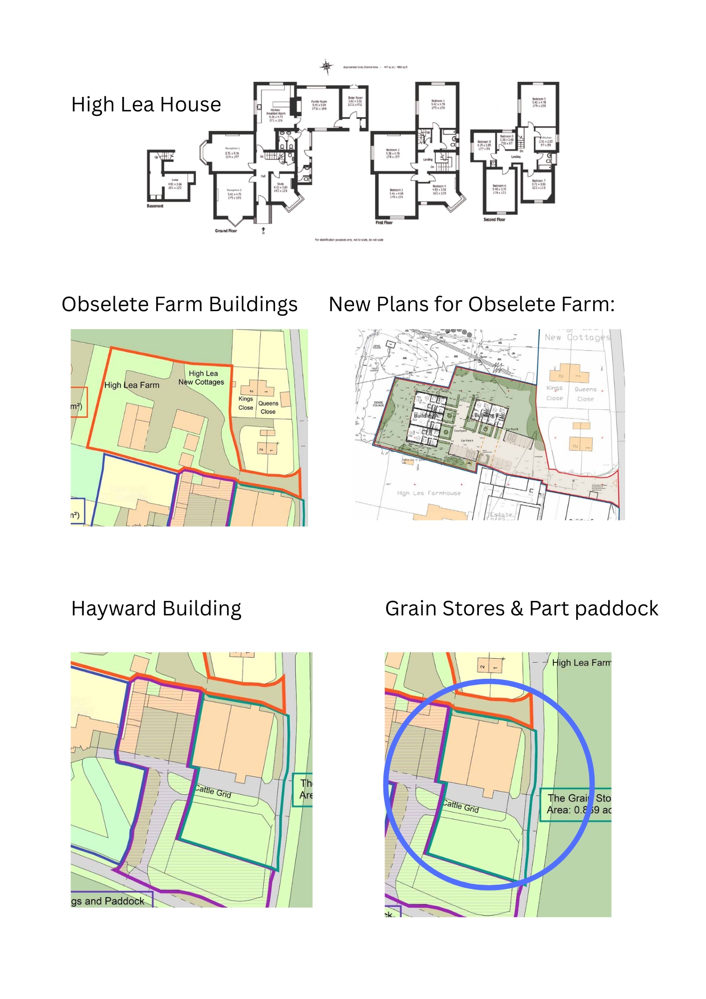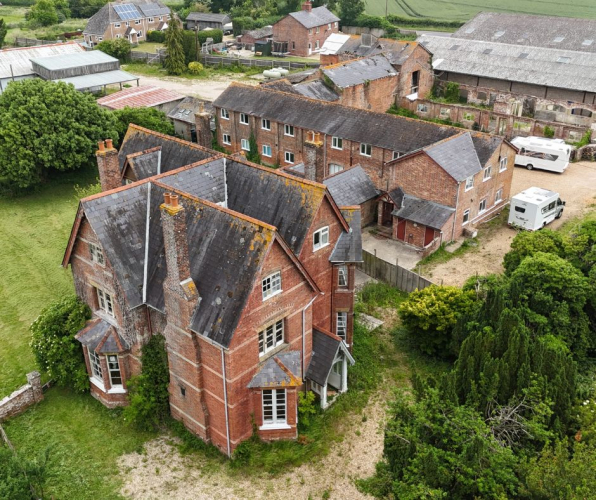 HIGH LEA stands at a country crossroads, the B3078 running from Cranborne to Wimborne, and Witchampton Lane running to Gaunts. Originally built of brick and slate as an extensive E-shaped, early Victorian Farmstead with huge farmhouse, nearly 200 years later, after modern farm adaptation and an incarnation as a particularly special school, it comes to the market exclusively or in parts, with a semi-detached cottage, paddock, a c.5 acre playing field, and permission for 5 new homes in obsolete farm buildings. High Lea House Ground Floor - An open-fronted Porch with a gabled slate roof opens to the long Hall with decorated quarry tiled floor, leading to two large Reception Rooms, a Study, ladies and gents WC suites, and the Farmhouse Kitchen, which leads onto the Dining Room. A concealed staircase leads down to the cellars. The Reception Rooms feature fireplaces, detailed cornicing, picture rails, a bay window and an A-frame window looking onto gardens. The Study has a brick and stone fireplace and box bay window. The Kitchen features oak countertops, a butler’s sink, breakfast bar, and Karndean flooring, with views of the garden and surrounding countryside. The Dining Room with floor-to-ceiling brick fireplace and inset range has views on two sides and an exit door to a mini-courtyard. First Floor - Up the stairs, past the half landing with display window, to three large bedrooms with WHB, and a fourth, all of which are found with feature fireplaces, box bay windows and detailed cornices. The Bathrooms need attention, (after school adaptations). . A concealed staircase leads up to the Second Floor large L-shaped landing with exposed A-frame timbers and rooflight, giving to four good-sized and one small bedrooms, an elegant Sitting Room with breakfast bar opening to the Kitchen, all with far-reaching views over the countryside, and a bathroom. The Farmhouse is surrounded on three sides by gardens, ample parking, mature oak and beech trees. The organic fruit & veg Kitchen Garden is surrounded by a Victorian wall, and overlooked by the Hayward Building. High Lea House has a private road access from Witchampton Lane. The property has been unused for a while, needs renovation, some new windows, and decoration. Asking Price: £1,300,000 The Hayward Building, Courtyard and Surrounding Buildings The old brick and slate Farm Buildings were converted from 1984 to School Classrooms, a Farm Shop and Café selling fresh foods, books, school materials, gifts; shop and farm storage; a Farm Butchery; Offices; Workshops, Accommodation, etc. The House and Hayward building have also been used as a School for Plumbers, and as a Retreat Centre. The Hayward Building, the western length of the Courtyard Buildings, with a new first floor, provided four double-size classroom and one regular, all with sinks and oil-fired central heating, two staircases, a small store, sheds, and attached Ladies & Gents Shower & WC block. The central length of the Courtyard Buildings was used a classroom and storage. The eastern length of the Courtyard Buildings was demolished in order to be rebuilt. The three story corner building, formerly a grain drying and processing mill, remains as it was. The Hayward Building, Courtyard and Surrounding Buildings have their own road access from Witchampton Lane, with off-road parking for dozens of vehicles, and a small paddock. The Hayward Range of Buildings offer great potential and, subject to planning permission, could be converted into stunning holiday cottages or residential dwellings. Asking price: £975,000 The Obsolete Farm Buildings The chalets would have, on the ground floor, 3 double bedrooms, an en-suite shower room, a family bathroom, a utility room, a pantry and a large kitchen/dining/family room overlooking the garden. Upstairs would be a main bedroom with dressing area and en-suite shower room. This terrace has been designed to be in keeping with the height and depth of the current building. The pair of semi-detached houses would have, on the ground floor, a snug, a shower room, and an open plan L-shaped kitchen/dining/family room leading out to the garden. Upstairs there would be 3 double bedrooms, all with en-suite facilities, a dressing room, an en-suite bathroom, and a terrace giving views across open farmland. The estimated gross development value of this is believed to be c.£3,500,000. Asking Price: £850,000 The Grain Stores are a series of two large barns currently occupied on an informal lease by Autovan Services Ltd who are paying £45,000 per year for a 9-year lease with a break clause at year 3 (Nov 2026). The properties have no current application for conversion but have been discussed previously as having potential for demolition and replacement with four, large, detached residential dwellings with gardens, or several semi-detached. The plot is just under half an acre, with its own access from B3078, plus a small paddock immediately south of The Grain Stores, currently used as parking for the tenants and their customers. Asking Price: £500,000 Cottage & Playing Field Field: £200,000 Cottage: £365,000