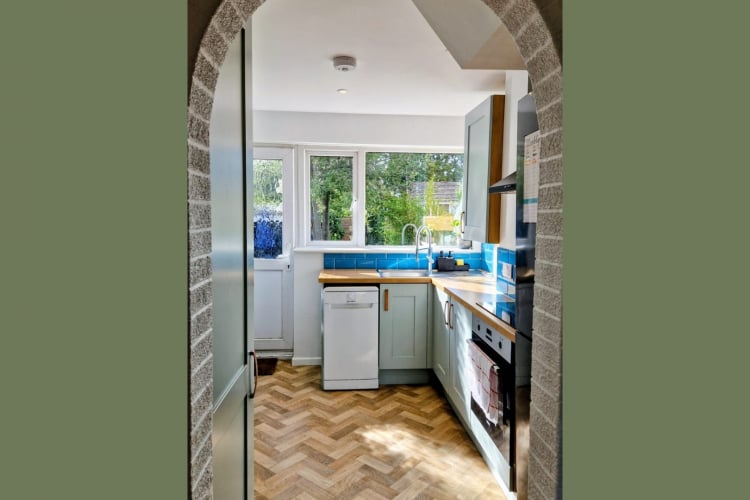 A well-equipped, newly refurbished kitchen with many low-level units and large wall units above, and a large larder cupboard. There is a built-in electric oven, an electric hob, and dishwasher. A stainless steel sink under a window overlooks the garden. Space for a large fridge freezer.