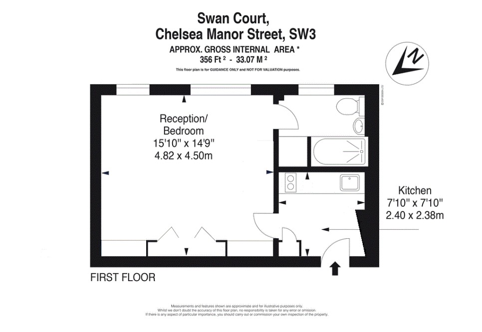 A rarely available Studio flat, with long lease, approx 356 sqft, is situated on the first floor in this ever popular mansion block in the heart of Chelsea. Swan Court is conveniently situated just south of Kings Road, with a wide variety of shops, restaurants and transport facilities at your doorstep. The open space of Battersea Park is just across the Albert Bridge, within 10 minutes walk, and has approximately 200 acres of open spaces with a stunning lake and numerous sporting facilities. The block has recently been upgraded/refurbished with new lifts, CCTV, a new secured key fob entry system as well as 24hr porterage. The Studio flat is in good decorative order with ample of natural light, a separate fully fitted kitchen (including dishwasher) and a shower room/utility room. There is a double bed hidden against the wall cleverly designed to maximise the living space for entertainment as well as providing generous built-in storage. The property also benefits from communal Hot Water & Heating which is included in the service charge. - Service charges from March 2025 to Sep 2025 is £1,712 (or £3424 per annum) - Council Tax (Band D) is £1,569/annum for 2025/26