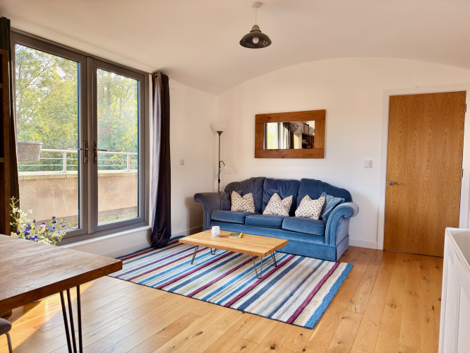 Versatile second bedroom with ample space for a double bed and wardrobe. Alternatively, this room could be configured as a spacious home office & guest room. The bright, airy feel is enhanced by large doors onto the private south-facing terrace, offering fantastic light throughout the day.