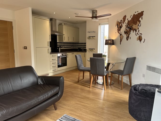 This is a bright, open plan space with sliding doors onto the balcony. The kitchen has a fridge-freezer and a dishwasher.