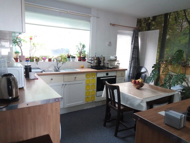 Window and external door to rear. Fitted with a range of wall and base units, sink with drainer, built-in single electric oven, four ring induction hob, space and plumbing for washing machine. Four double electric sockets.