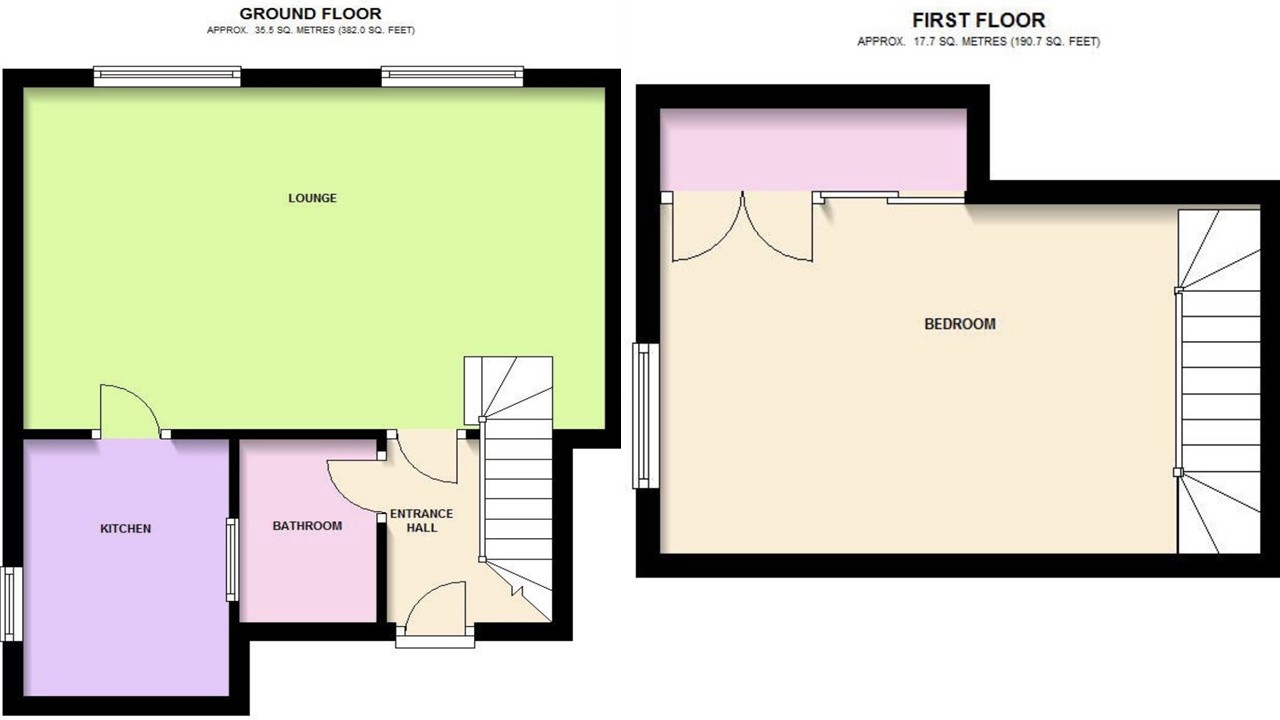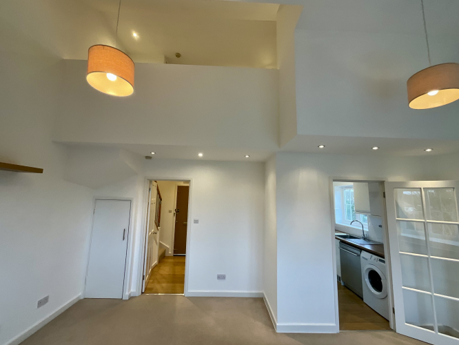 Wooden flooring, carpeted stairs to bedroom, electric heater, entry phone, access to lounge & shower room.