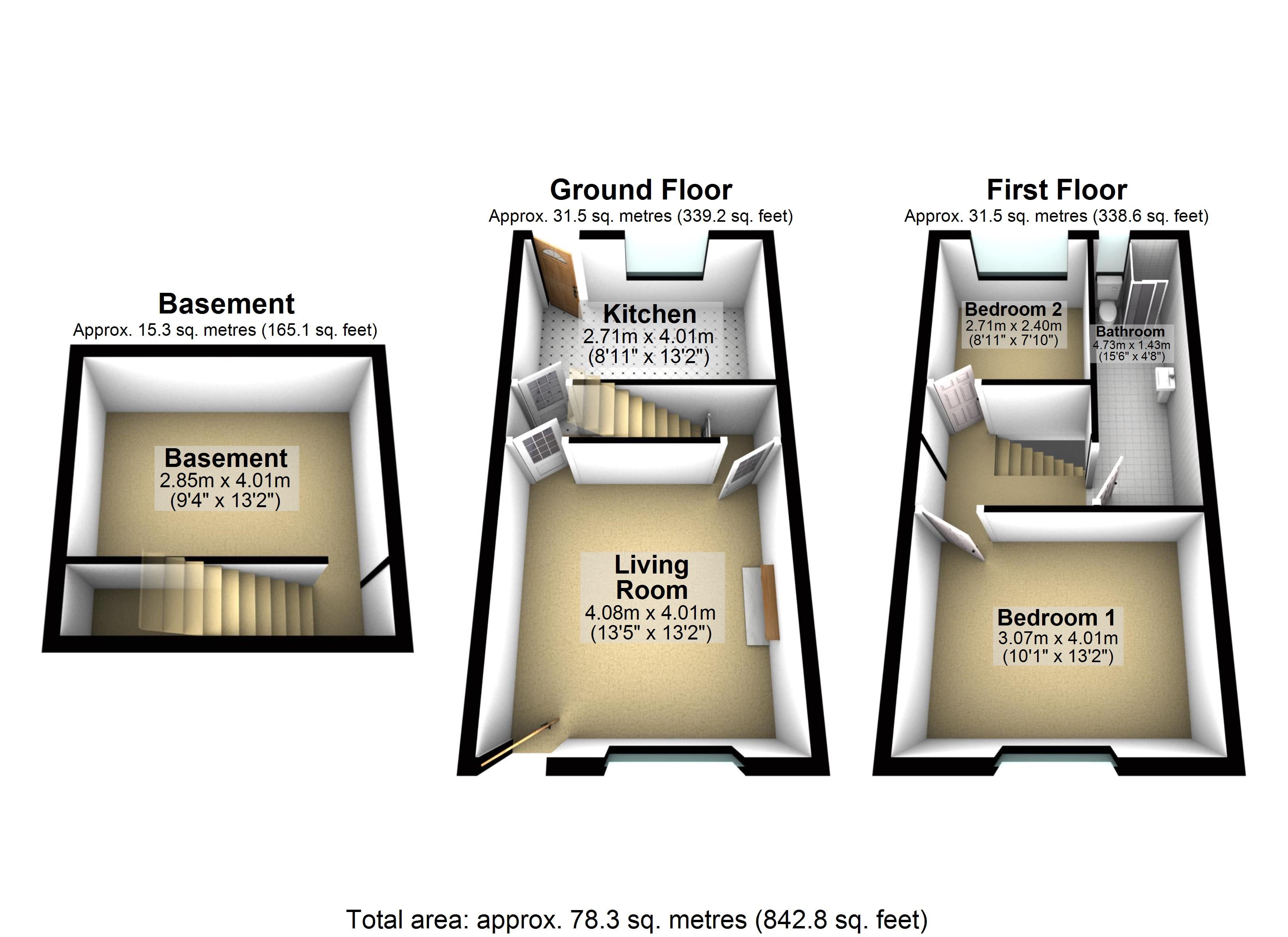 In need of refurbishment, the kitchen has plumbing for an automatic washing machine, sink, work surface and cupboards. A double glazed window looks out on to the rear yard. Stairs lead down to the useful storage cellar which has lighting and the rear door leads to the outside space.