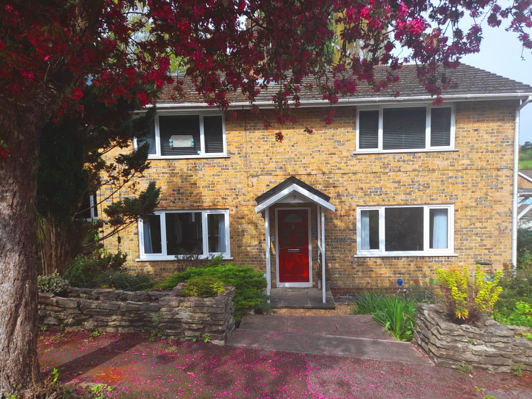The Private Front Garden is Bursting with Shrubs and Small Trees. From the pavement, where 'on road' parking can be found, there are Steps leading down to the Storm Porch and New Composite Front Door. Gravel Pathway leads to rear of property, garage and private parking.