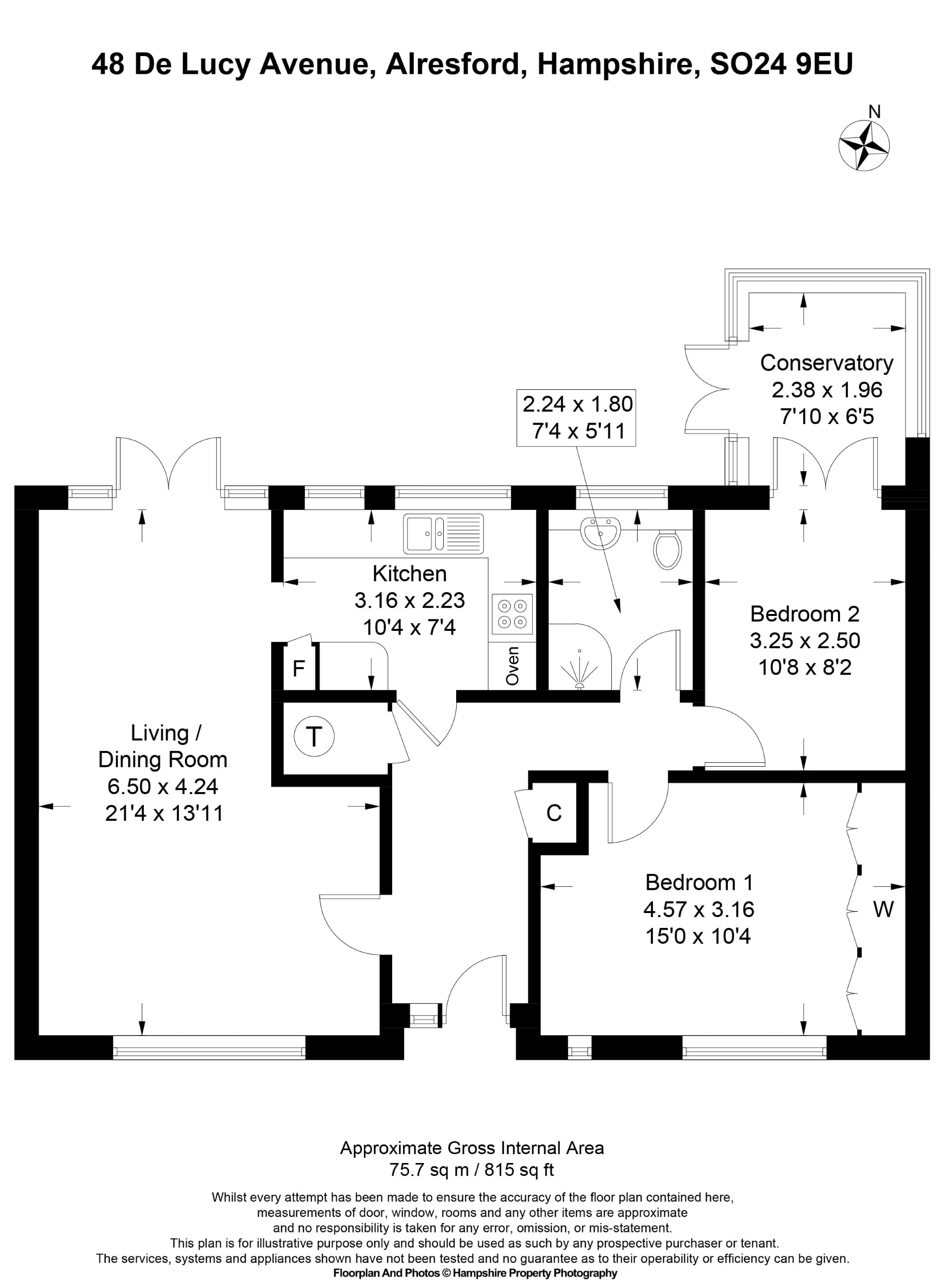 Located in a quiet and friendly residential area, just a few minutes’ walk from a regular bus service to Winchester, Alton and Petersfield. This attractive double fronted terrace bungalow has a welcoming porch. The front door opens into a spacious central entrance hall, fitted with an original renovated wood parquet floor. The hall accesses a large, dual aspect, light and airy living room with feature fireplace, a bay window to the front, and a dining area and French doors to the rear. An archway from the dining area leads to the fully fitted kitchen, which includes all integrated Bosch & Neff appliances; fridge/freezer, washer/dryer, dishwasher, multifunction oven, gas hob, cooker hood, and a built-in microwave. Worktops & windowsills are in a complementary granite and the room is completed with an easy care Marmoleum floor. A door leads from the kitchen back to the central hallway, off which is an attractive bathroom with fitted basin, cupboards and toilet (no bath). The walk-in shower, has a large dual head thermostatic shower and is easy access with a low sill. The two double bedrooms also open from the hallway. The main bedroom is a spacious room, located at the front of the property and including a bay window. One wall of this bedroom is fully fitted with bespoke Sharps wardrobes. The second bedroom is at the rear, with French doors to a conservatory which overlooks the rear landscaped gardens. The conservatory could be used for a variety of purposes, including providing a separate working from home space. At the rear, the pretty garden is designed for easy maintenance. Outside the living room is a large patio with sandstone paving, a short flight of steps leads to a shaped lawn area and flower beds, followed by further steps to a sunny paved circle which provides a further seating area. The garden is completed with a south facing, cedarwood, combined greenhouse and storage shed. A rear access path provides two routes from the rear to the road, at either end of the terrace (locked gates, secure this access). A single garage and driveway are located at one end of the terrace of three bungalows. The garage measures 4.7m long by 2.5m wide (15ft 5” x 8ft 2”) – the centre garage in the photographs. Located in the beautiful market town of Alresford, in Hampshire, approx. 8 miles from Winchester and 12 miles from Alton. The local shops are a 15-minute walk along a pleasant tree lined path called The Avenue. Alresford has a number of independent shops, including two butchers, fruiterer and fish monger, as well as two supermarkets. There is a centrally located Health Centre, two Opticians, and two Dental practices. The 64 Stagecoach Bus service operates through Alresford, with journey times of 16 and 30 minutes to Winchester & Alton respectively. The 67 Stagecoach bus runs to Petersfield. The nearest bus stop is a 3-minute walk from the property.