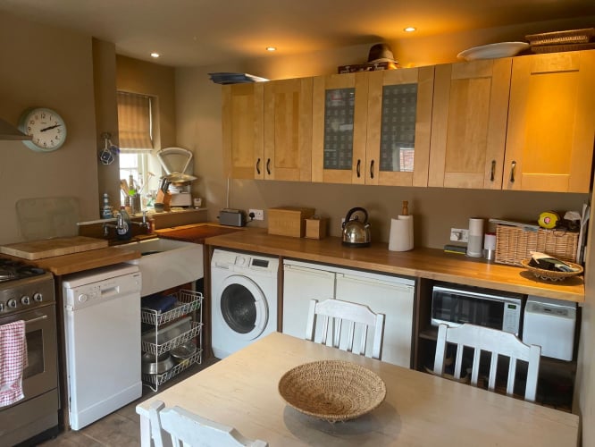 Oak floor. Fitted units floor and ceiling. Solid Beech worktop. Butler sink. Housing cooker, dishwasher, washing machine and fridge freezer. Fitted character cabinet for crockery and cutlery. Room for table and chairs. Bay window to the front.