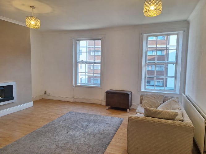 Impressive second floor lounge with two sliding sash windows at front of property overlooking pedestrianized square. Radiator. Laminate wood flooring. Chimney breast fitted with gas fire.