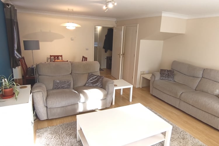 A bright and airy open plan living room/dining room with laminate flooring, patio doors to the garden.