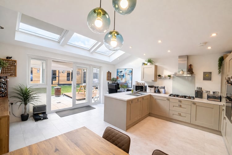 Modern wall and base units with laminate worktops, 1½ stainless steel sink and mixer tap. Integrated washing machine, dishwasher, double oven, four-ring gas hob and extractor. Three Velux skylights, UPVC French doors to rear garden, spotlights and radiator.