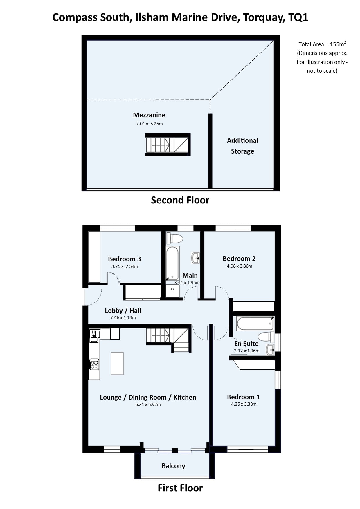 This beautifully presented, top floor, south-facing seafront apartment is part of an exclusive luxury development of just eight residences, offering uninterrupted panoramic views across the breathtaking Tor Bay coastline. Situated on Torquay’s prestigious Ilsham Marine Drive - adjacent to Thatcher Rock and just steps from the scenic South West Coast Path. This prime location combines natural beauty with refined living. The spacious interior features a welcoming lobby and entrance hall leading to three generously sized, fitted, double bedrooms, two stylish bathrooms and main living area. The stunning light-filled open-plan lounge, dining and kitchen area provide extensive ocean views and include the staircase to a mezzanine floor. The kitchen area includes built-in appliances: gas hob, electric oven, microwave, dishwasher and fridge/freezer. A hall cupboard houses the boiler, washer/dryer combo and storage space. The mezzanine floor receives natural light from the double-height lounge area windows and a roof skylight. It is large enough to include extra beds/TV lounge/office furniture and substantial storage spaces. Additional benefits include a secure private garage with electric door, as well as ample visitor parking within the development. Access to the top floor apartment is via a locked front door up the stairs between the garages. A telephone intercom from outside allows the release of locks for visitors. Sale of existing furnishings can be negotiated. This is coastal living at its finest - Ideal as a permanent home or luxurious seaside retreat. Services Mains water, gas, electricity and drainage are all connected, subject to the necessary authorities and regulations. Gas fired central heating with radiators. Current Property Tax Band G payable Torbay Council Mobile Phone Coverage / Broadband EE and 02 (estimated Ofcom Data) Lease Terms 999 year from 01 Jan 2000 lease, remaining period 974 years. General Guidance Assured short-hold tenancies of a minimum of six months are allowed. Pets and holiday letting is strictly prohibited. Money Laundering Regulations 2003 Prospective purchasers are advised that we will ask for identification documentation and proof of financial status when an offer is received. We ask that this is made available at the earliest opportunity to prevent any unnecessary delay in agreeing a sale. Disclaimer 1 We endeavour to make our sales particulars as fair, accurate and reliable as possible. But please be advised that they are only intended as a general guide to the property and should not be relied upon as statements of representation or fact. If there are any points of particular importance then you are advised to contact us to verify the position. Disclaimer 2 The room sizes are only intended as a general guide to prospective purchasers and are not precise. Whilst every attempt has been made to ensure the accuracy of the floor plans, they are designed for illustrative purposes only. No responsibility will be taken for any errors contained in these plans. You are advised to verify any dimensions before ordering floor coverings and furniture. Although currently using all the services, equipment and appliances in this property, we strongly recommend that prospective purchasers commission their own service or survey reports, before finalising their offer to purchase.