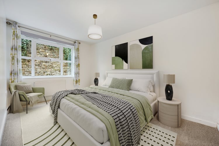 Window overlooking woodland and the communal gardens. Two central heating radiators.