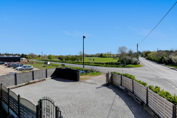 Bright kitchen with white shaker units, laminate worktops and a ceramic butler sink. Features a five ring gas hob, built-in double oven, integrated dishwasher & washing machine. Triple-aspect double-glazed windows with shutters. Double-glazed bi-fold doors. Inset spotlights, LVT flooring & radiator.