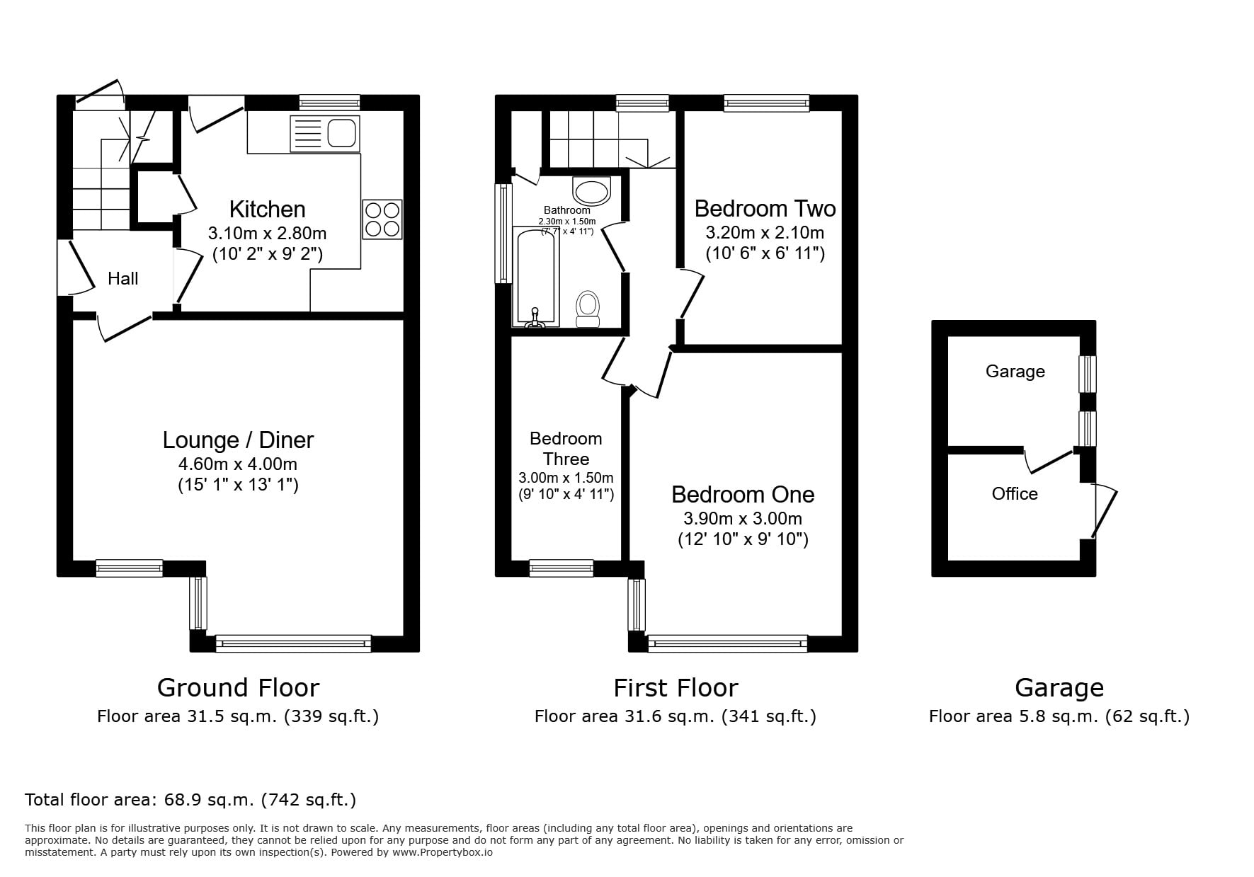 The garage has been partially converted to a home office space, benefitting from a radiator connected to main central heating system. The rear remains garage space for storage or use as a workshop.
