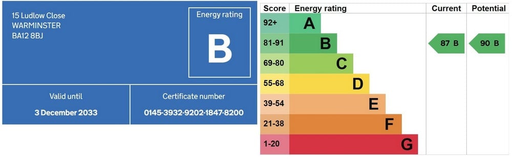 **15 Ludlow Close, Warminster, BA12 8BJ** **A Rare Opportunity to Own a Detached 3 Bedroom Bungalow in a Highly Desirable Location** We are delighted to present this stunning detached 3 bedroom bungalow, situated on a large corner plot in the heart of Warminster. This exceptional property boasts a unique blend of character, style, and modern amenities, making it the perfect home for those seeking a tranquil and luxurious living experience. **Accommodation** The property comprises three spacious bedrooms, each with its own unique charm and character. Two of the bedrooms feature stylish ensuites, perfect for those who value their independence and luxury. The third bedroom is a delightfully cozy retreat, ideal for a home office, dining room or hobby room. A well-appointed cloakroom completes the accommodation, providing a convenient and stylish space for guests. **Living Spaces** The triple aspect stunning sitting room is a true showstopper, bathed in natural light and offering views of the surrounding gardens. This spacious room is the perfect place to relax and unwind, whether you're enjoying a good book, a glass of wine, or simply taking in the beauty of the outdoors. **Exterior** The large block-paved driveway (could be further extended) has a double wall socket (useful for trickle charging an electric car from any excess electric from the solar panels) as well as an Ohme electric car charger. The front garden has a mature (possibly 50 year-old?) imported olive tree, two areas of lawn, a coastal flower bed, two fruitful blackcurrant bushes, and a palm tree, as well as wide gate to back garden. The delightful low-maintenance private back garden has a high quality artificial lawn, patio, two garden sheds, both with power to them, one of which was built in 2025 could be used for motorbike storage having wide access and slabbed floor, a canopy with clothes hanging as well as power, and outside tap. When the sun shines there are always areas to be in the sun or shade. All of the curtains and blinds, throughout, were professionally custom made using only Laura Ashley fabrics and all are included in the sale, as are carpets. Gas Central Heating Photovoltaic Solar Panels (owned and generating an income) 9.5kWh storage battery (is operating perfectly and is less than 3 years old, but is not under warranty) Mains water/sewerage Council Tax Band D EPC B